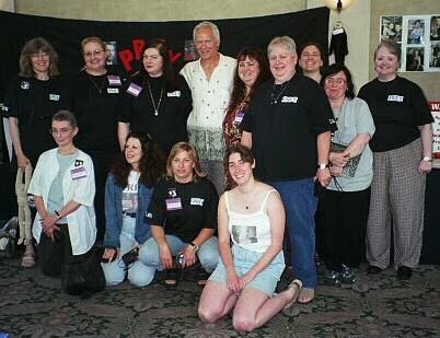 It was the first day of the con and we were excited. We called for a bellman to take down the things for the PREY table, as all of our volunteers seemed to have overslept. After getting everything down to the convention hall, we put together the cage and set up our stuff on the table. We had tons of stuff. PREY Pens, PREY Pencils, Bumper Stickers, Magnets, Bookmarks, Key Chains, T-Shirt Transfers, Stickers, Postcards, Petitions, and the autographed photos of Debra Messing. Also decorating our area was a working microscope complete with hair samples from ‘Tom’ and ‘Lynch’, and a gorilla in a cage that sang ‘Rescue Me’ when you squeezed his paw. Lee Ann’s photo collection was up on the wall. One end of the table held the TV and VCR that played our tapes over and over. In the center was a stand with 36 international flags representing all of the countries where PREY fans live. It was very impressive. The other end held the big cage with the cutout of Tom inside…and all over the place hung an assortment of monkeys wearing ‘You Will All Die’ signs.