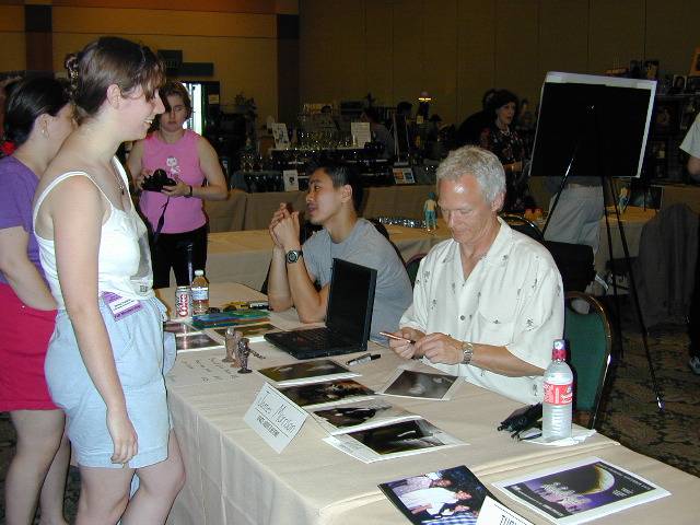 Several hours later I had mostly recovered and was sitting behind the PREY table when Joel de la Fuentes and a man walked by. A few of the preymates were wondering who the other fellow was. I looked up and frowned – he looked kind of familiar, so I followed them into the dealer room where Tucker Smallwood was ensconced behind the autograph table. They split up and a minute later another familiar face wandered by. My jaw dropped…it was Rodney Rowland! He hadn’t even been in the list of possible attendees! My brain finally kicked into gear and I realized the other man had been Morgan Weisser. His hair was cut shorter than a genuine marine’s and he was wearing glasses that looked like the PX had issued them…it definitely did not do him justice. I dashed back to the PREY table to report and found Lee Ann in a tizzy. She had recognized Rodney as he walked through the courtyard and was literally speechless. Well, she was making noises, but only the kindest person would classify those noises as speech.